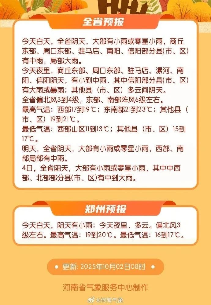 今天白天,全省阴天,大部有小雨或零星小雨,商丘东部、周口东部、驻马店、南阳、信阳部分县(市、区)有中雨,局部大雨。今天夜里,商丘东部、周口东部、驻马店、漯河、南阳、信阳阴天,有小到中雨,其中信阳部分县(市、区)有大雨或暴雨;其他县(市、区)多云间阴天。全省偏北风3到4级,东部、南部阵风6级左右。