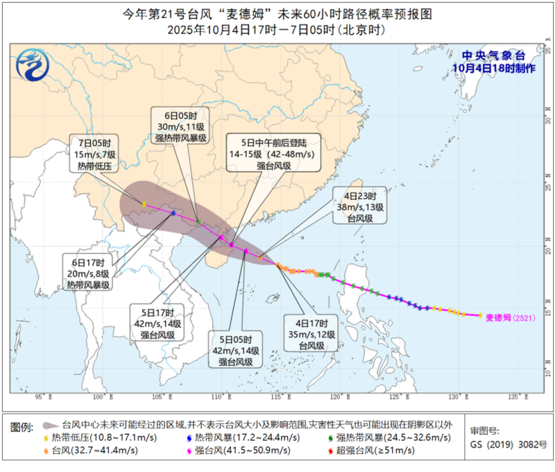 预计,“麦德姆”将以每小时25公里左右的速度向西偏北方向移动,强度继续增强,逐渐向广东西部到海南岛东部一带沿海靠近,并将于5日中午前后在广东电白至海南琼海一带沿海登陆(强台风级,14-15级,42-48米/秒),登陆后强度逐渐减弱。
