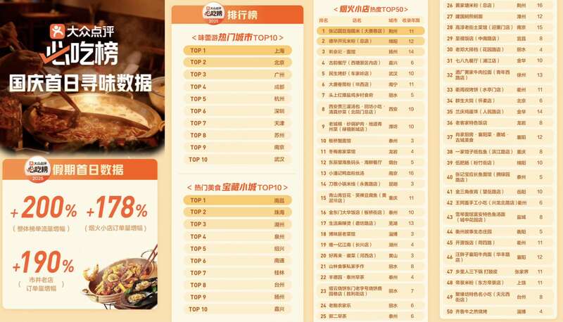 其中,上榜小店流量增幅超125%、订单量涨超178%,上榜老店流量涨超130%、订单量涨超190%;上海、北京、广州、成都、杭州、深圳、天津、苏州、南京、武汉为“味蕾游”热门城市TOP10,南昌、珠海、湖州、泉州、绍兴、南通、桂林、台州、扬州、嘉兴为热门美食宝藏小城TOP10;扬州劉佘記·面馆、荆州张记圆豆泡糯米(大赛巷店)、襄阳汪胖子襄阳牛肉面(华丰路店)等跻身烟火小店热度TOP50,其中超10家流量增幅超300%,超半数为收录10年及以上的市井老店。