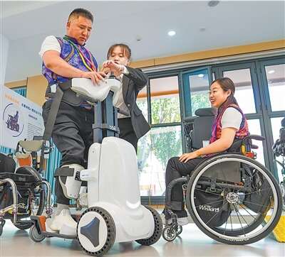 内蒙古呼和浩特市,一名残疾人在站立机器人的辅助下直立。