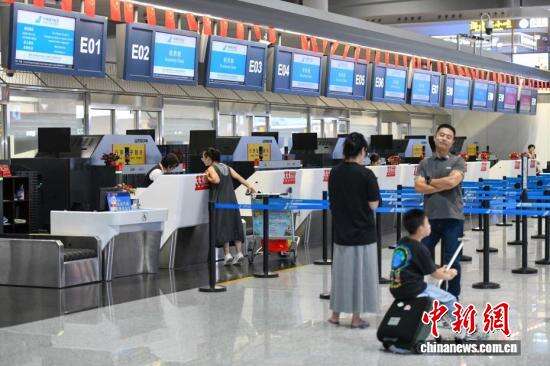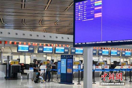 中新社记者 骆云飞 摄 旅客在海口美兰国际机场T2航站楼服务台问询航班信息。