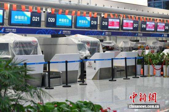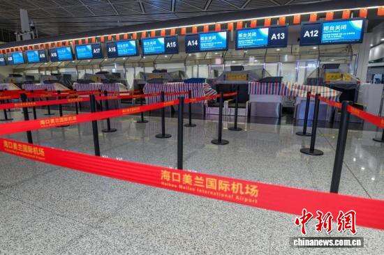 中新社记者 骆云飞 摄 海口美兰国际机场T2航站楼内的值机柜台已做好防御台风准备。