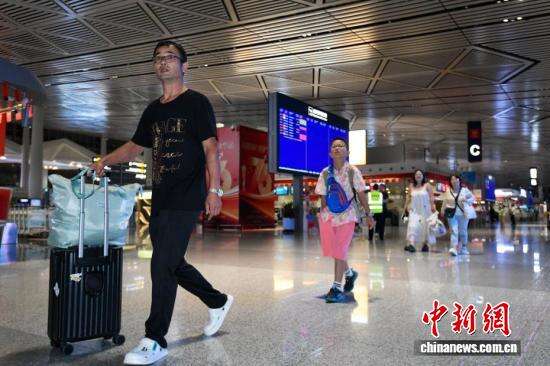 中新社记者 骆云飞 摄 在海口美兰国际机场T2航站楼出行的旅客。