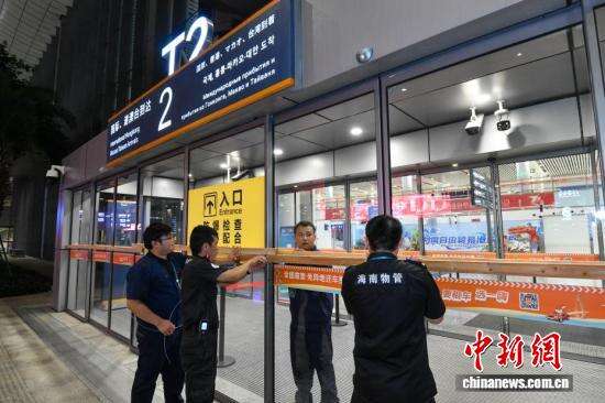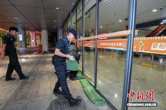 中新社记者 骆云飞 摄 海口美兰国际机场工作人员加固出入口的玻璃门,为防御台风做准备。