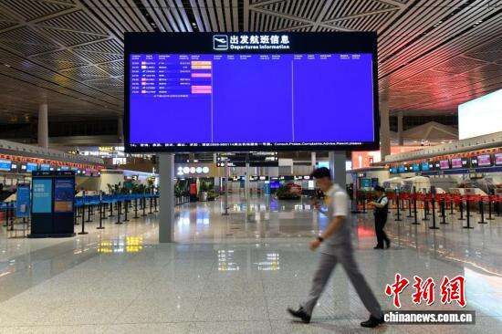 中新社记者 骆云飞 摄 一位工作人员在海口美兰国际机场T2航站楼显示屏前经过。
