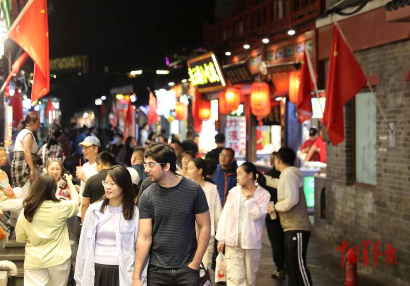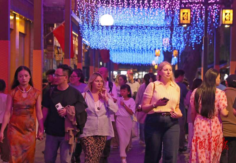 10月4日,位于北京中轴线旁的什刹海,游客穿梭在灯光长廊。中青报·中青网记者 陈剑/摄