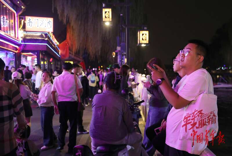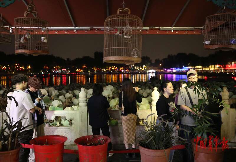 10月4日,位于北京中轴线旁的什刹海,人们在湖边驻足观赏夜景。中青报·中青网记者 陈剑/摄