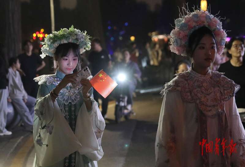 10月4日,位于北京中轴线旁的什刹海,身穿“簪花围”服饰的女孩一手拿着国旗一手刷着手机。中青报·中青网记者 陈剑/摄