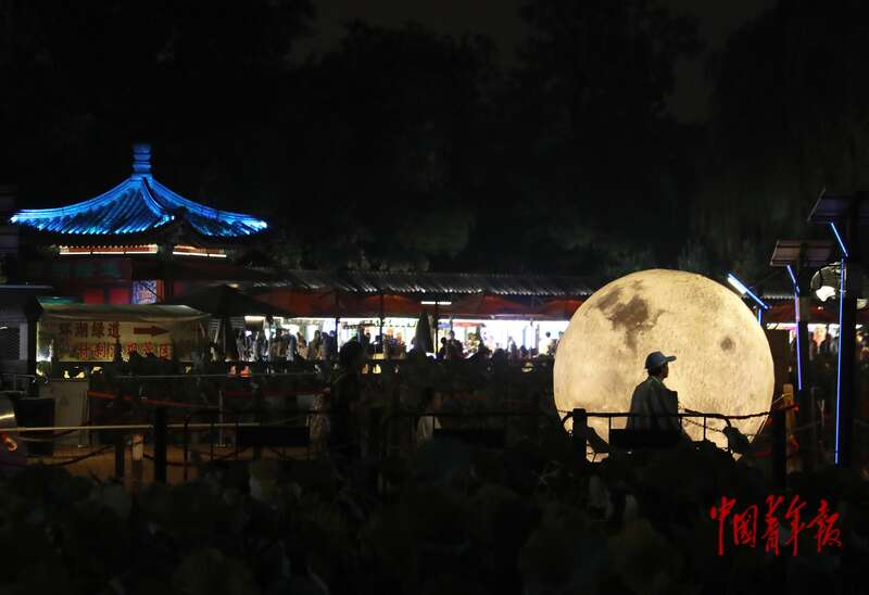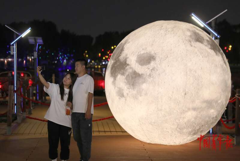 10月4日,位于北京中轴线旁的什刹海,两名游客在游客码头边的巨型月球灯前合影留念。中青报·中青网记者 陈剑/摄