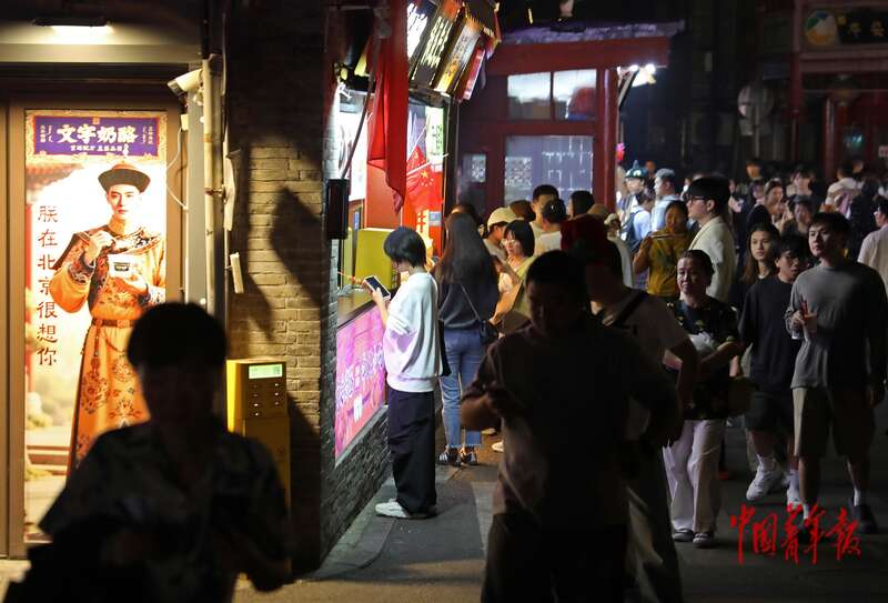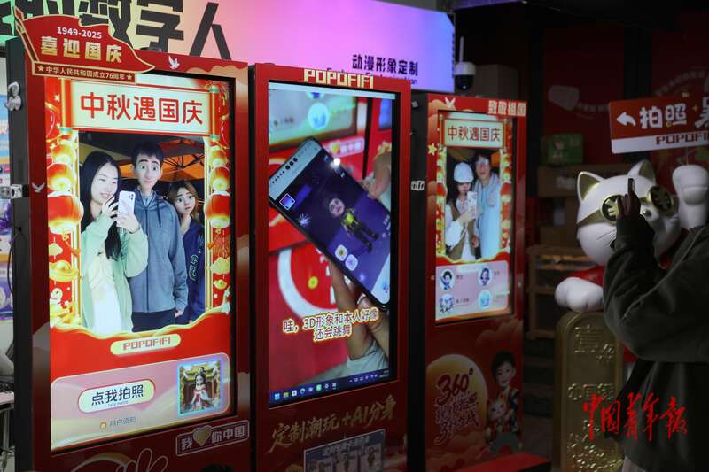 10月4日,位于北京中轴线旁的什刹海,年轻人在“中秋遇国庆”的动漫形象定制机器前拍照。中青报·中青网记者 陈剑/摄