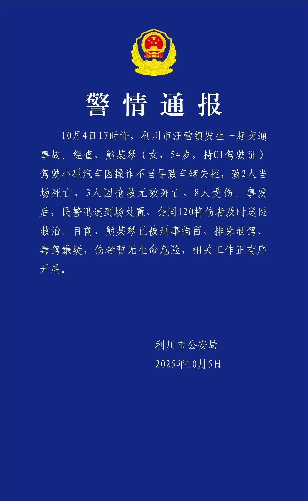 10月4日17时许,利川市汪营镇发生一起交通事故。经查,熊某琴(女,54岁,持C1驾驶证)驾驶小型汽车因操作不当导致车辆失控,致2人当场死亡,3人因抢救无效死亡,8人受伤。事发后,民警迅速到场处置,会同120将伤者及时送医救治。目前,熊某琴已被刑事拘留,排除酒驾、毒驾嫌疑,伤者暂无生命危险,相关工作正有序开展。