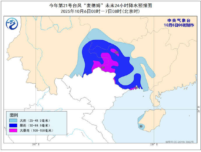 降水预报:10月6日08时至7日08时,广西中西部、贵州西南部、云南东南部、海南岛西部等地部分地区有大到暴雨,其中,广西西部、云南东南部等地部分地区有大暴雨(100~190毫米)。