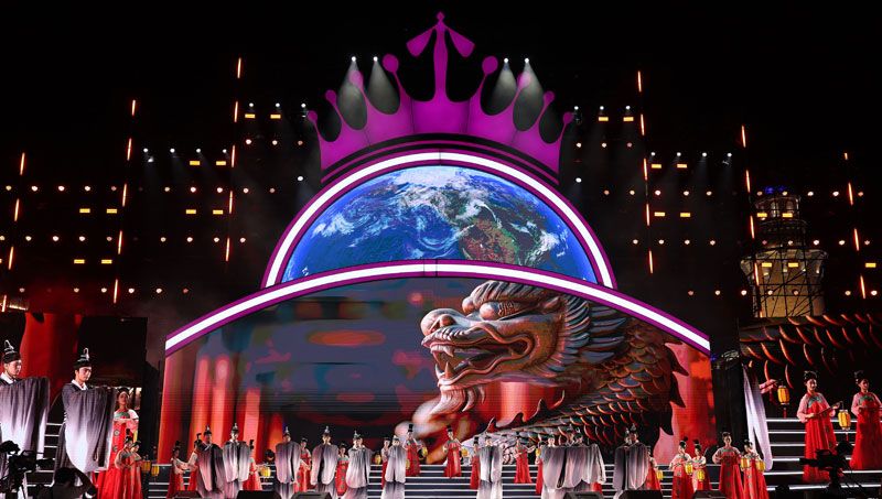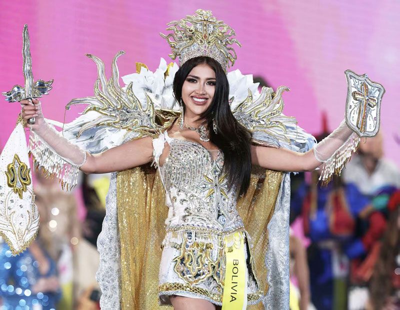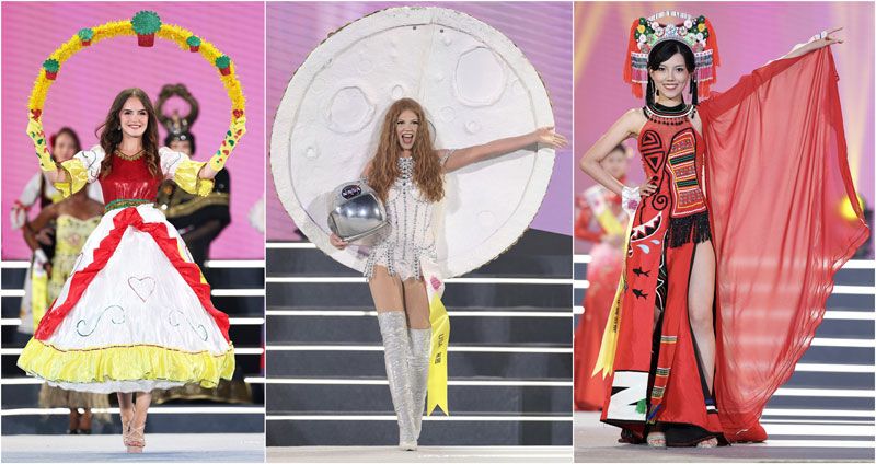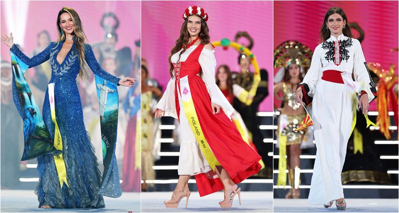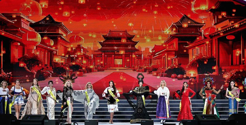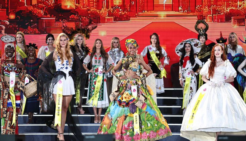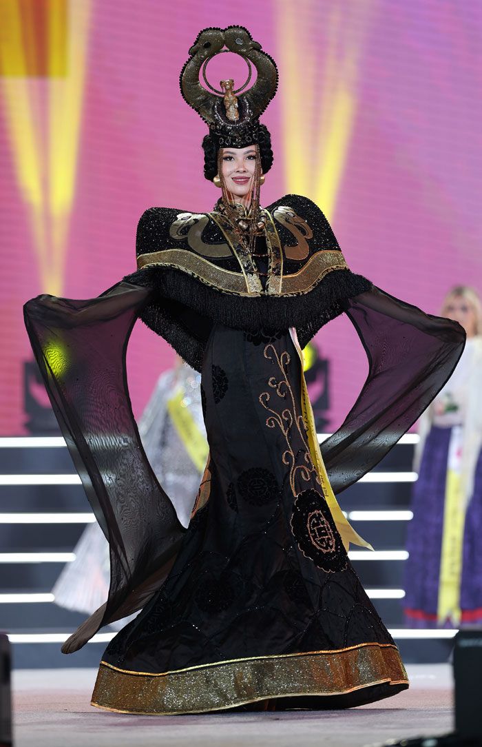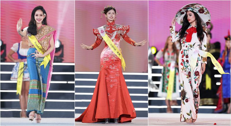在绚丽多彩的灯光和节奏明快的音乐伴奏下,67位佳丽身着各民族服饰逐一亮相,她们千姿百态、笑容灿烂,就是一场美轮美奂的民族服装大秀。作为东道主的中国选手张诗涵压轴出场,她身着著名服装设计师熊英"盖娅传说"品牌的大红色的民族服装,婀娜多姿,十分抢眼,赢得了满场喝彩。