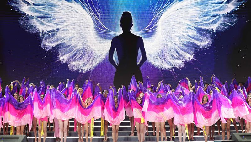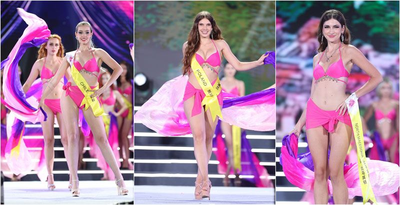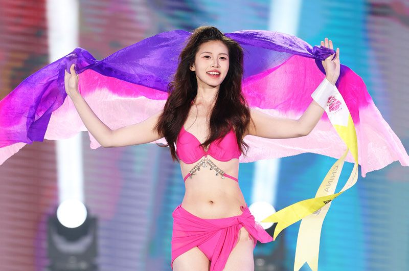 接下来的音乐、鼓点,更加强烈,激情澎湃泳装环节把总决赛推向了高潮,选手们开心的舞动着多彩的丝巾,凹凸有致的身材尽显无疑,现场观众们报以热烈掌声。
