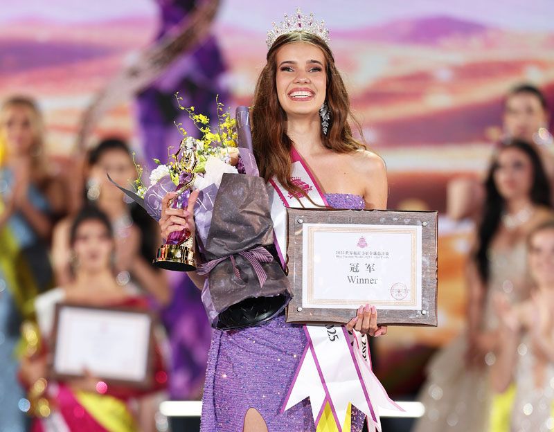 当主持人念到她的名字时,她双手捂嘴不敢相信,眼中泛起了泪花。她成为67名参赛佳丽中的唯一,夺得了2025世界旅游小姐全球总决赛的冠军。