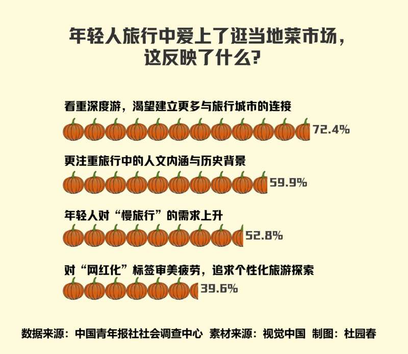 调查中,52.8%的受访青年认为,年轻人在旅行中逛菜市场反映了对“慢旅行”的需求上升。
