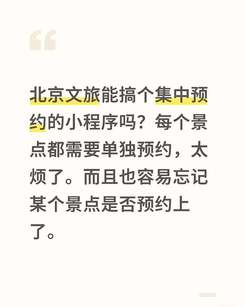 比如,一些游客通过社交平台反映,预约故宫、国家博物馆、天坛等不同景点,需分别登录不同的公众号或小程序,反复填写个人信息,流程复杂且不易统筹管理行程。针对游客的需求,北京市文化和旅游局相关负责人最近透露,整合全市文旅资源的“统一在线预约平台”正在开发测试,将于近期正式上线。