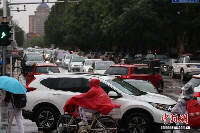 10月9日,北京市通州区,持续降雨加重了国庆假期后早高峰的拥堵,民众在雨中赶着通勤通学。