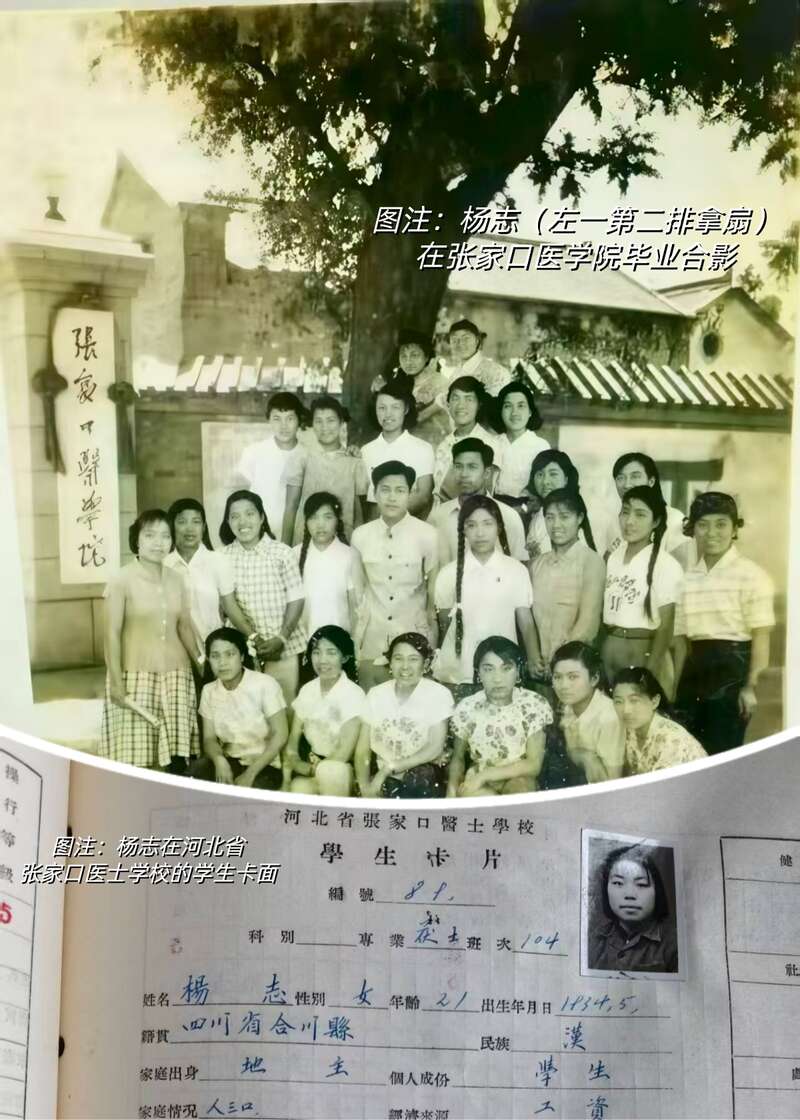 尤为珍贵的是,滕玉平提供的一张老照片,与校史紧密相连。照片记录了1958年7月1日张家口医士学校升格为张家口医学院挂牌当日,杨志所在班级在新校牌前的合影。照片上清晰地标注着:“二排左一拿扇子的是杨志”。这张照片,如今正陈列在校史馆中,旁边展示的正是1958年时任张家口医学院院长郎宝信提出的“双又六能”办学理念:向着“又红又专”“能文能武”“能中能西”“能防能治”的康庄大道前进。