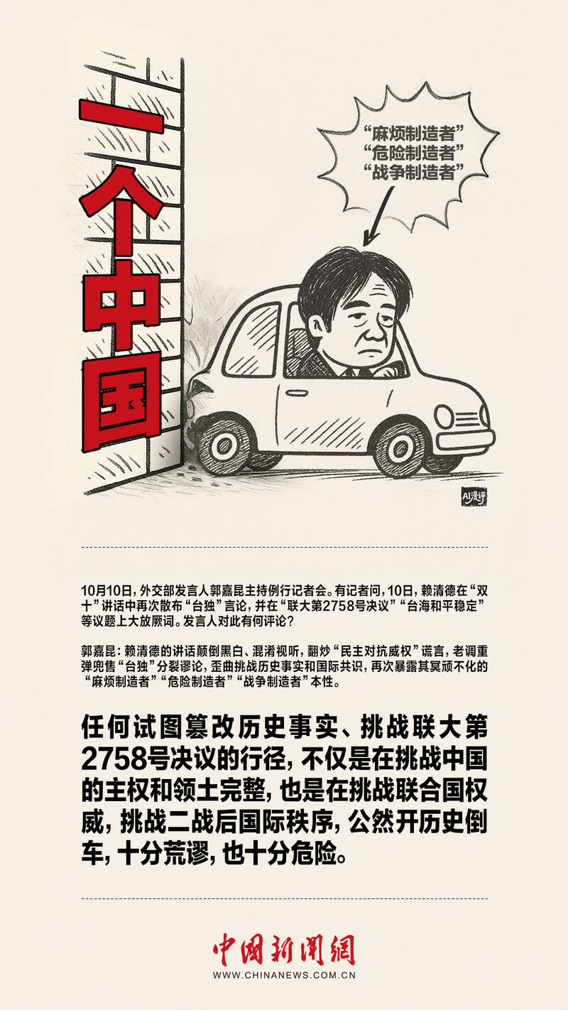 任何试图篡改历史事实、挑战联大第2758号决议的行径,不仅是在挑战中国的主权和领土完整,也是在挑战联合国权威,挑战二战后国际秩序,公然开历史倒车,十分荒谬,也十分危险。