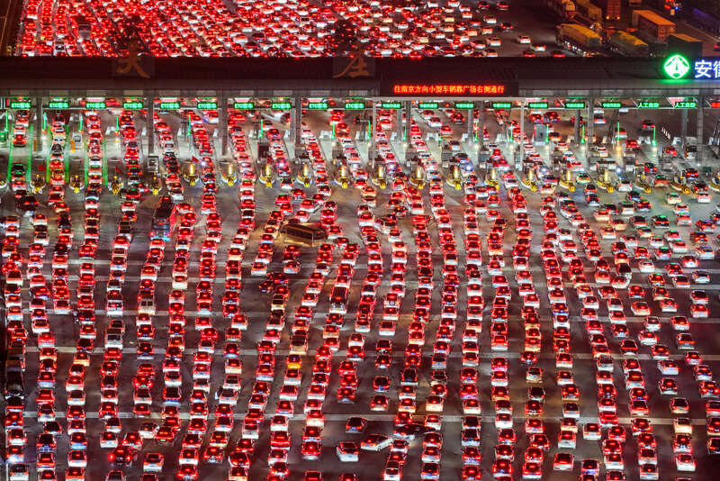 10月7日,安徽省滁州市,航拍吴庄收费站的长假返程车流。吴庄收费站是我国最大规模的高速收费站,位于皖苏交界,双向设置36车道闸口。视觉中国供图