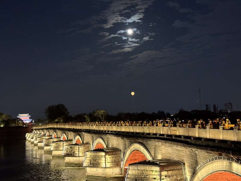 10月6日,北京,中秋之夜,月光映照卢沟桥,“卢沟晓月”景观引来众多市民游客观赏。直径5米的“光影月亮”从宛平城西南城墙缓缓升空,与天空中的真月亮相映成趣。视觉中国供图