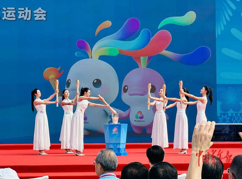 10月9日,第十五届全国运动会和全国第十二届残疾人运动会暨第九届特殊奥林匹克运动会火种采集仪式在广州海洋地质调查局科考码头举行。采火少女在“源火”台引燃手中的采火棒。据介绍,全运圣火“源火”来自南海1522米深的海底,通过引燃可燃冰的方式获取。中青报·中青网记者 林洁/摄