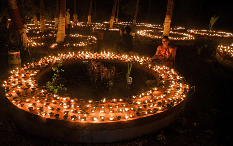 当地时间10月6日,印度孟买,一名女子手持泥灯庆祝月圆节。视觉中国供图