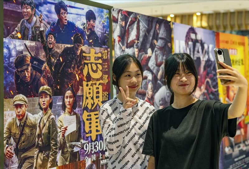 10月4日,江苏省泰州市,观众在海陵区万达影城电影海报前拍照留念。据网络平台数据,截至10月3日19时10分,2025年国庆档电影总票房(含预售)突破9亿。视觉中国供图