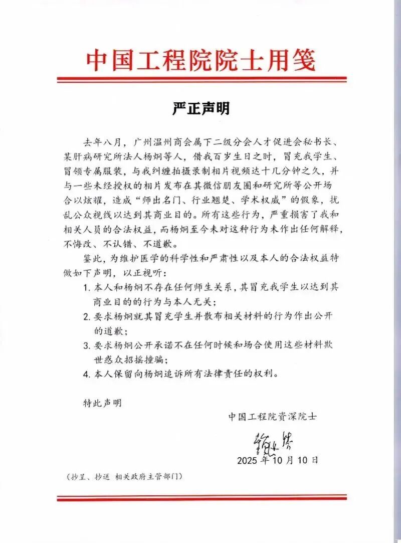 近日,我国解剖学泰斗、中国工程院院士、中国临床解剖学创始人钟世镇院士发布严正声明,指出去年在他百岁生日庆典期间,遭杨炯等五人冒名闯入并违规拍摄影像资料,这些影像资料随后被用于不当宣传。声明称自己与杨炯不存在师生关系。