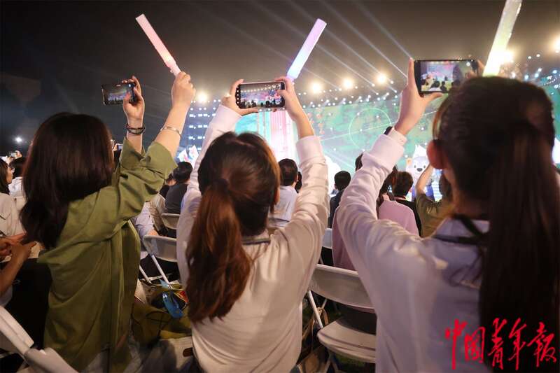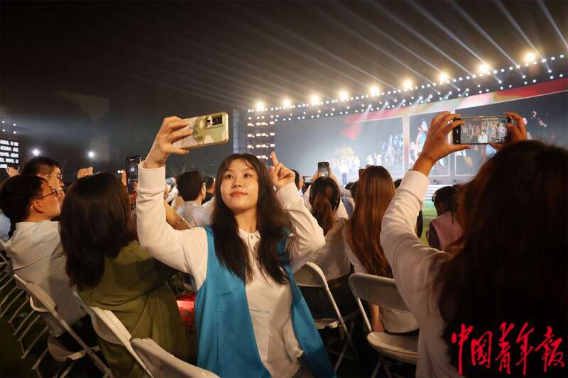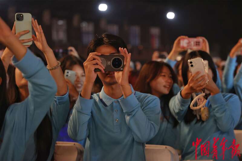 10月12日晚,江苏南京,2025青春华章活动现场,一位大学生在拍摄自己跟舞台的合照。中青报·中青网记者 王鑫昕/摄