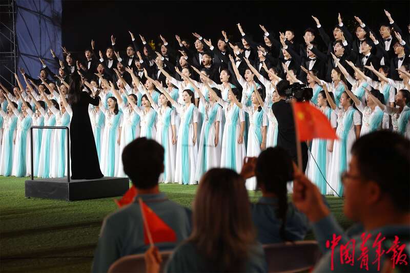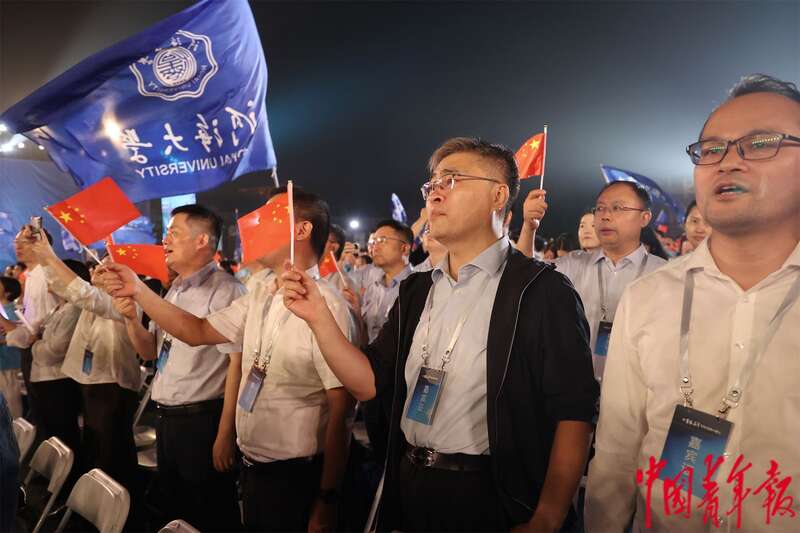 10月12日晚,江苏南京,2025青春华章活动现场,数千名河海大学师生齐唱校歌《大哉河海奔前程》。中青报·中青网记者 王鑫昕/摄