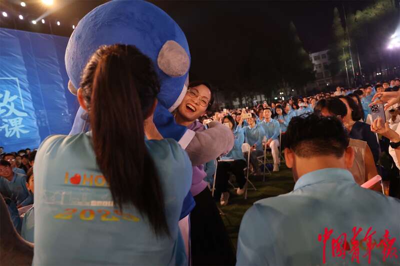 10月12日晚,江苏南京,2025青春华章活动现场,师生和“苏超”吉祥物豚宝拥抱。中青报·中青网记者 王鑫昕/摄