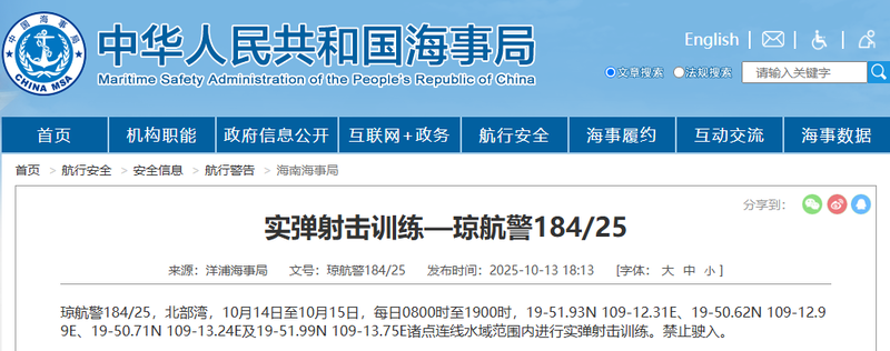 中国海事局网站消息,洋浦海事局发布航行警告,10月14日至10月15日,每日8时至19时,北部湾部分海域进行实弹射击训练,禁止驶入。