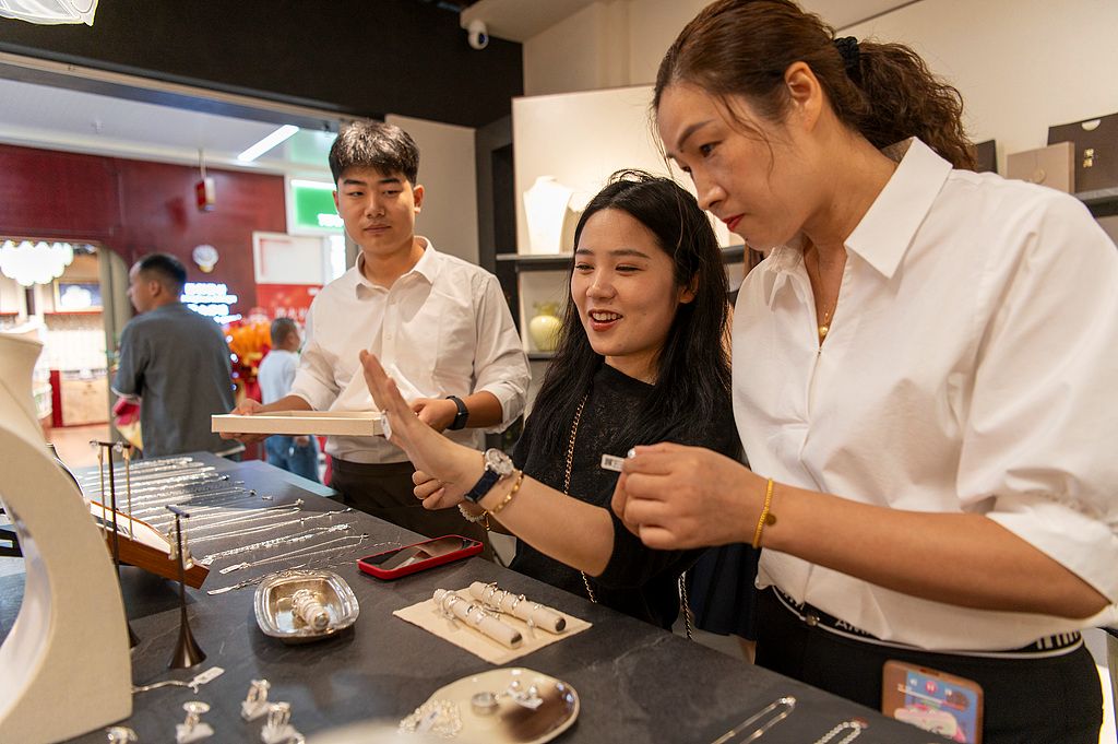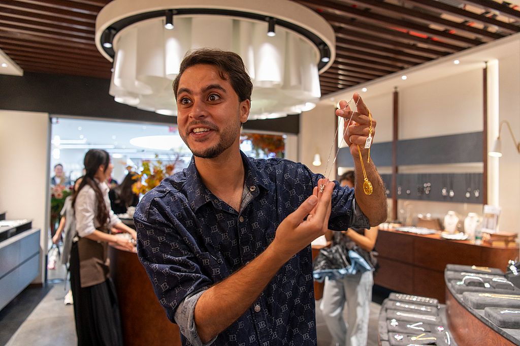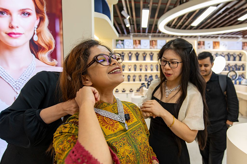 2025年10月14日,浙江省金华市义乌全球数贸中心市场里,国内外客商在选购时尚珠宝饰品。10月14日,浙江省金华市“世界超市”义乌迎来第六代市场,全球数贸中心正式开业运营。这标志着义乌市场完成新一轮迭代升级,开启从传统贸易模式向数字贸易生态跃升的新进程,并朝着打造数字化、国际化、现代化、低碳化的全球贸易标杆地破浪前行。