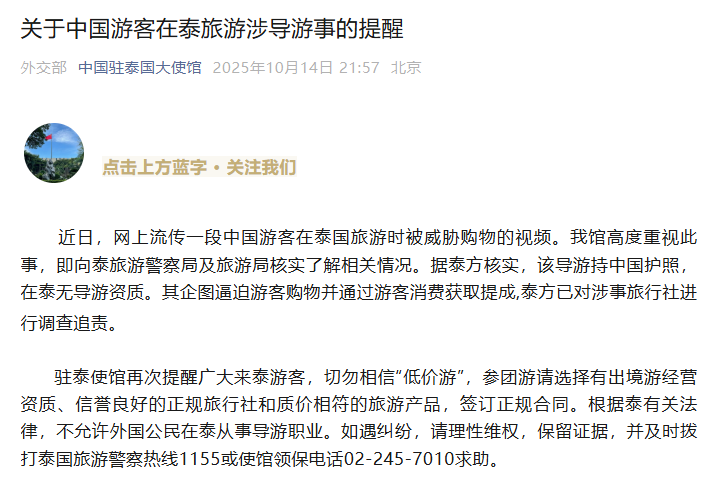 14日,中国驻泰国大使馆发布关于中国游客在泰旅游涉导游事的提醒: