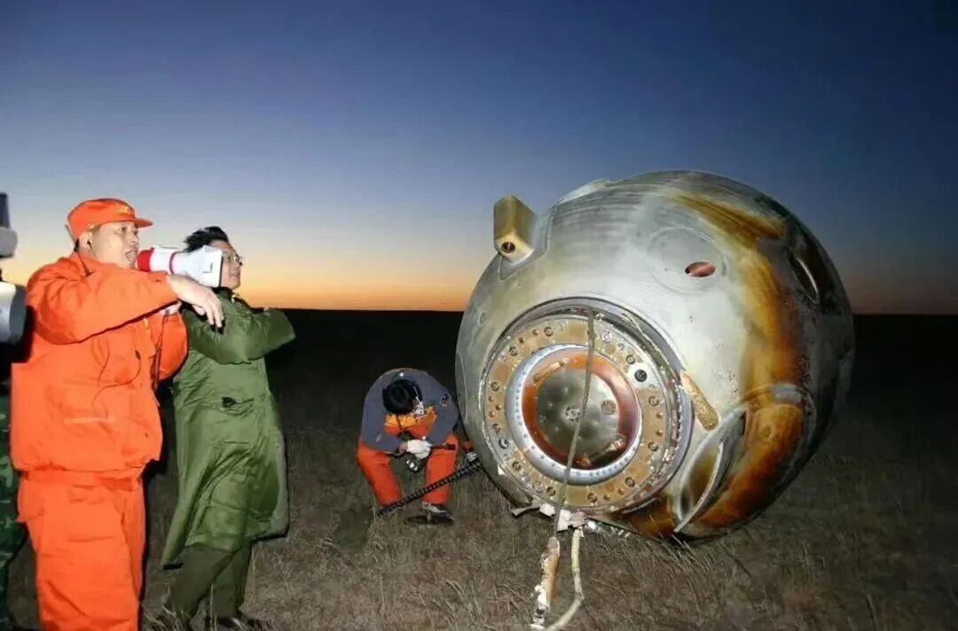 飞船返回舱在内蒙古主着陆场成功着陆,实际着陆点与理论着陆点相差4.8千米,返回舱完好无损。首飞航天员杨利伟在飞行21小时23分后顺利返回。