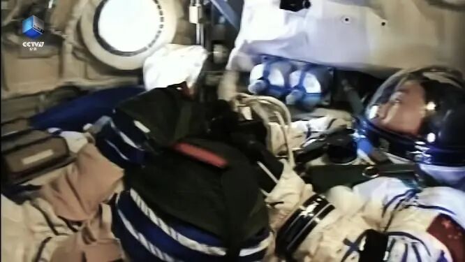 进入飞船返回舱的杨利伟坐到了特制的座椅上。此时,按计划离火箭发射还有2小时45分钟。起飞前,杨利伟在舱内进行各项准备,完成100多个动作。地面指挥控制中心屏幕显示,杨利伟生理参数正常。
