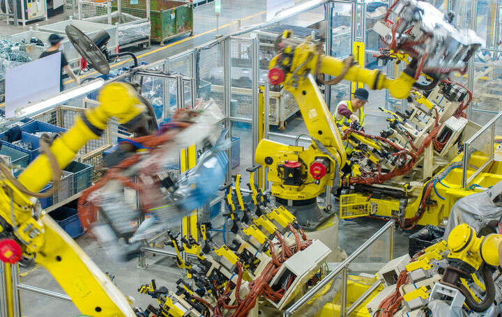 2025年10月9日,浙江省湖州市长兴经济技术开发区一家汽车部件有限公司的技术人员操控工业机器人生产新能源汽车配件(无人机照片)。新华社发(谭云俸摄)