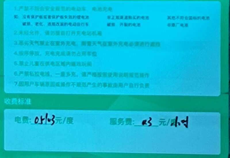 《告诫书》中还提到,“各电动自行车充电设施经营单位应在充电场所、手机应用程序、微信公众号等显著位置分别标示充电电价、服务费项目和收费标准,倡导服务费计价单位与充电电费计价单位(度)保持一致,便于消费者计算。”然而,记者调查发现,仍有部分经营单位并未做到。