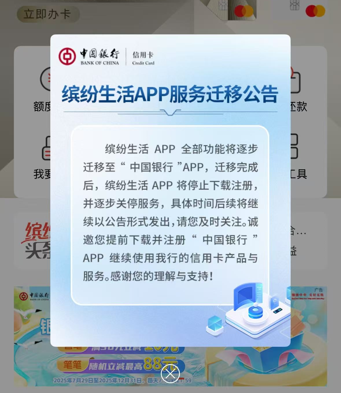 “用了好几年的中行‘缤纷生活’APP竟然要关停了,以后像查账单、换积分这些事,都要到‘中国银行’APP去处理了。”近日,杭州市民蒋女士在登录“缤纷生活”APP时,发现APP服务迁移的弹窗公告。