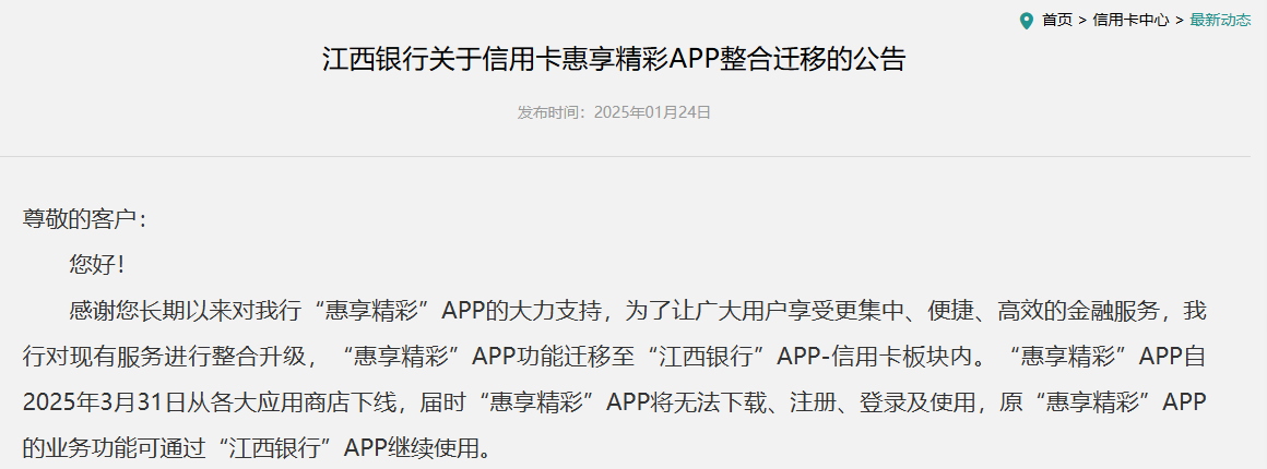 今年就有多家银行已相继采取行动。3月,北京农商银行旗下的信用卡APP“凤凰信用卡”业务功能迁移至“北京农商银行手机银行”APP;江西银行旗下“惠享精彩”APP也于3月31日在各大应用商店下线,相关功能迁移至江西银行APP信用卡板块内。