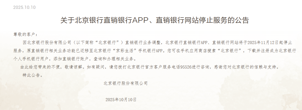 10月10日,北京银行发文称,旗下直销银行APP、直销银行网站将于2025年11月12日起停止服务,原直销银行相关业务功能已迁移至北京银行 “京彩生活”手机银行APP。