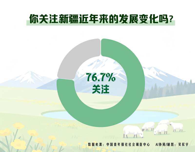今年是新疆维吾尔自治区成立70周年。近年来,《我的阿勒泰》等影视剧的热播掀起一波新疆旅游热潮,新疆也受到越来越多人的关注。上周,中国青年报社社会调查中心联合问卷网(wenjuan.com),对1668名青年进行的一项调查显示,61.0%的受访青年去过新疆。76.7%的受访青年关注新疆近年来的发展变化。社交媒体平台(65.3%)和新闻媒体报道(60.0%)是受访青年关注新疆的主要渠道。