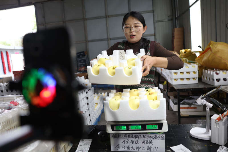 2025年10月14日,新农人李大方在自己的电商创业基地通过网络平台直播带货销售礼县苹果。新华社记者 陈斌 摄