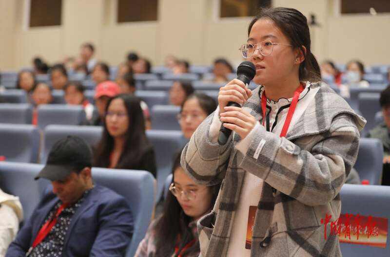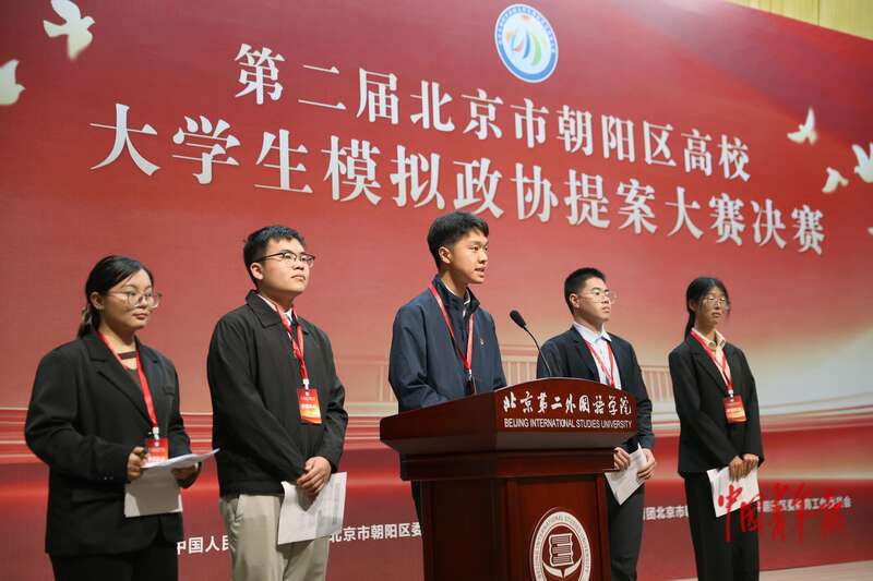 10月16日,北京第二外国语学院,来自中国传媒大学的学生代表进行提案陈述。当日,第二届北京市朝阳区高校大学生模拟政协提案大赛决赛在北京第二外国语学院举行。本次活动由提案陈述、协商讨论、专家点评、评委打分四部分组成,来自北京第二外国语学院、对外经济贸易大学、北京工业大学等16所高校的青年学子上台,各抒己见。从完善就业实习机制到优化营商环境,从博物馆之城建设到推进绿色低碳生活,提案内容涵盖了社会生活的方方面面,充分展现了当代大学生对社会问题的敏锐洞察力和积极担当的精神风貌。中青报·中青网记者 陈剑/摄