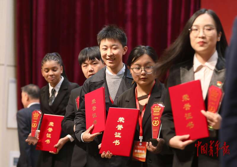 10月16日,北京第二外国语学院,第二届北京市朝阳区高校大学生模拟政协提案大赛决赛结束后,获奖大学生代表手捧奖杯和证书。中青报·中青网记者 陈剑/摄