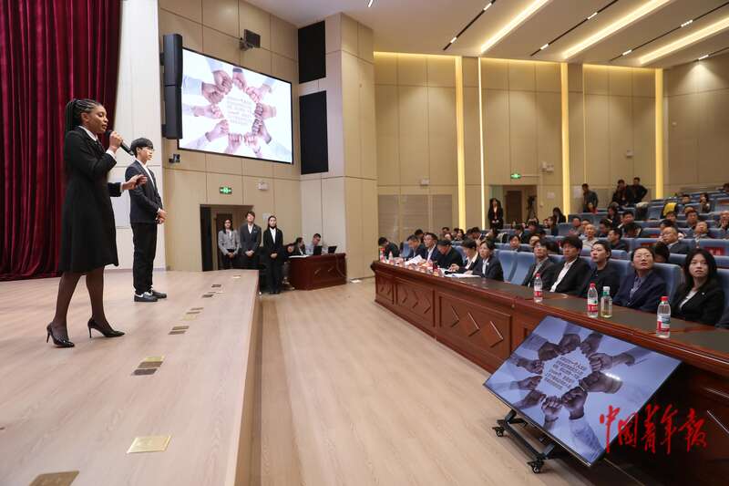10月16日,北京第二外国语学院,第二届北京市朝阳区高校大学生模拟政协提案大赛决赛现场,来自该校的学生代表阿吉尔(赤道几内亚籍,左一)和屈原博(左二)在进行提案陈述。中青报·中青网记者 陈剑/摄