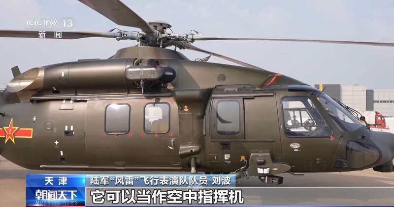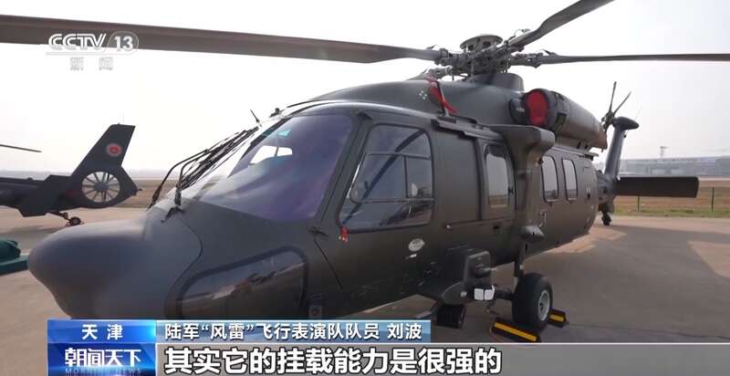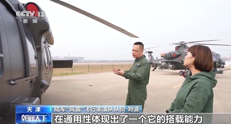 陆军“风雷”飞行表演队队员 刘波:从飞机的外观能看到,直-20比直-10的体量大,直-10的前后舱就两名机组人员,直-20的机组人员,包括后舱,还可以搭载一些作战队员,在通用性体现出了它的搭载能力,也就是说,它是介于武装直升机和运输型直升机中间的一个机型。