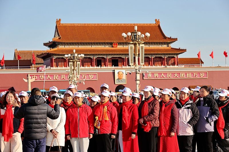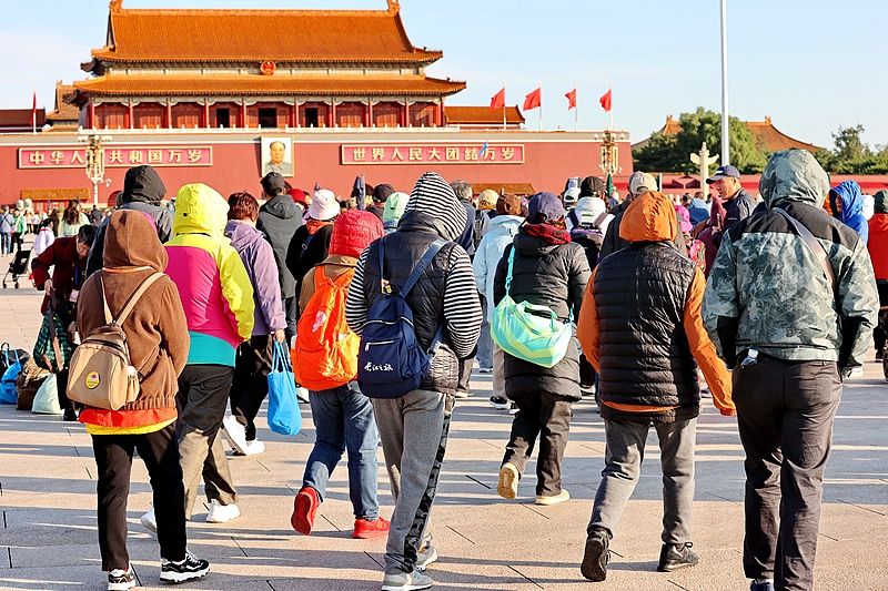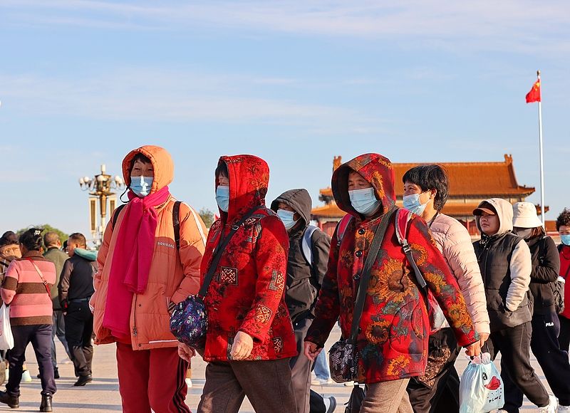 2025年10月18日,北京,游客在天安门广场穿厚衣御寒。当日北京持续寒潮天气,最高气温跌至11摄氏度,体感干冷。
